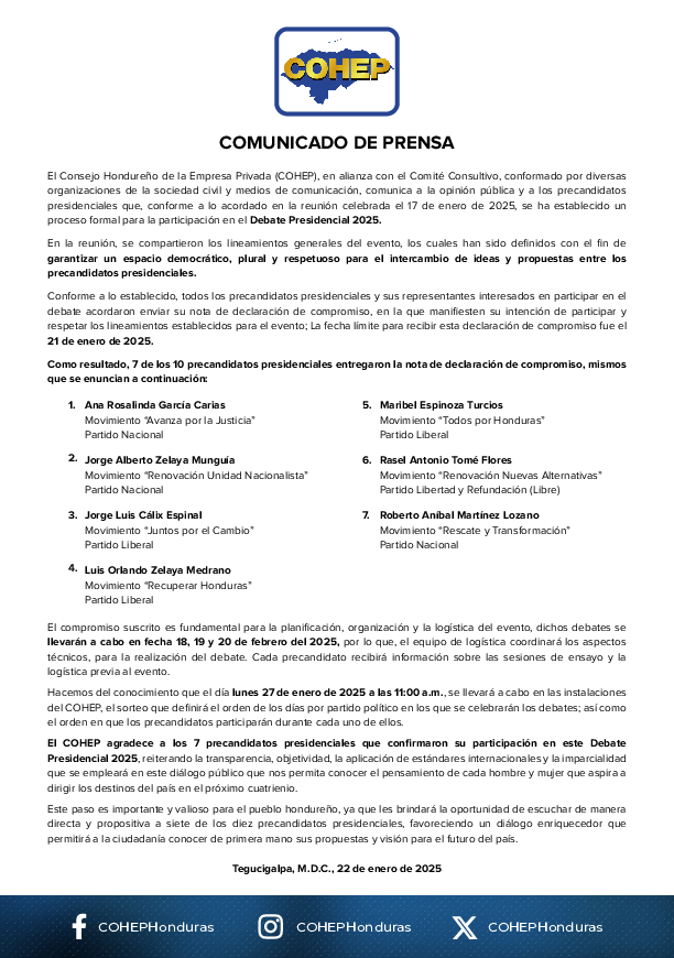 COMUNICADO - Debates Presidenciales COHEP 2025
